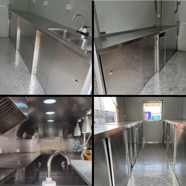 AXEL KIT, STAINLESS STEEL KITCHEN, ANTI-FATIGUE MATS, VENDING WINDOW, CEILING FINISHES WITH COLOR OPTIONS: BLACK, WHITE, GRAY, PVC FLOOR, ONE (1) PAINTED STEEL SECURITY DOOR.