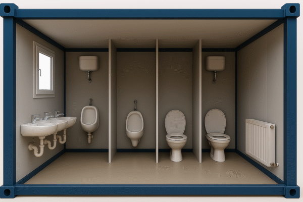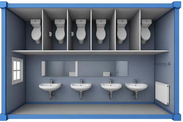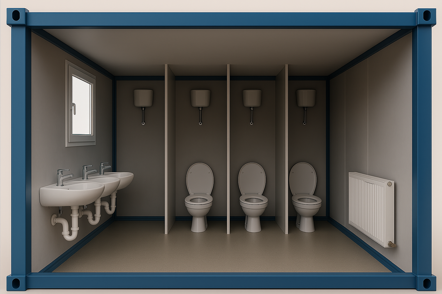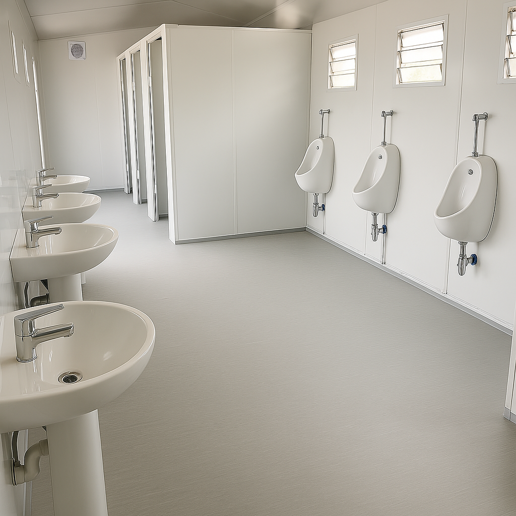 FIVE (5) TOILETS, TWO (2) URINAL, SIX (6) WASHBASIN, WALL AND CEILING FINISHES WITH COLOR OPTIONS: BLACK, WHITE, GRAY OR NATURAL. MANUAL, INSTRUCTIONAL VIDEOS AND TECHNICAL SUPPORT, THE PRODUCT IS DELIVERED DISASSEMBLED, TRANSPORT AND ASSEMBLY SERVICE AVAILABLE. (AVAILABILITY SUBJECT TO PURCHASE VOLUME).
