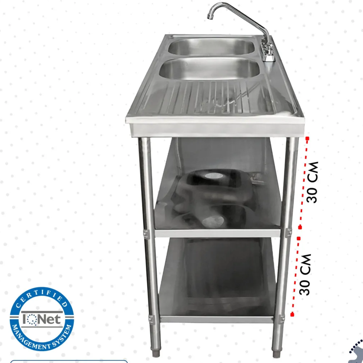 DOUBLE INTERLOCK: Incorporates two stainless steel shelves with reinforcements, providing additional space for organizing and storing kitchen utensils.